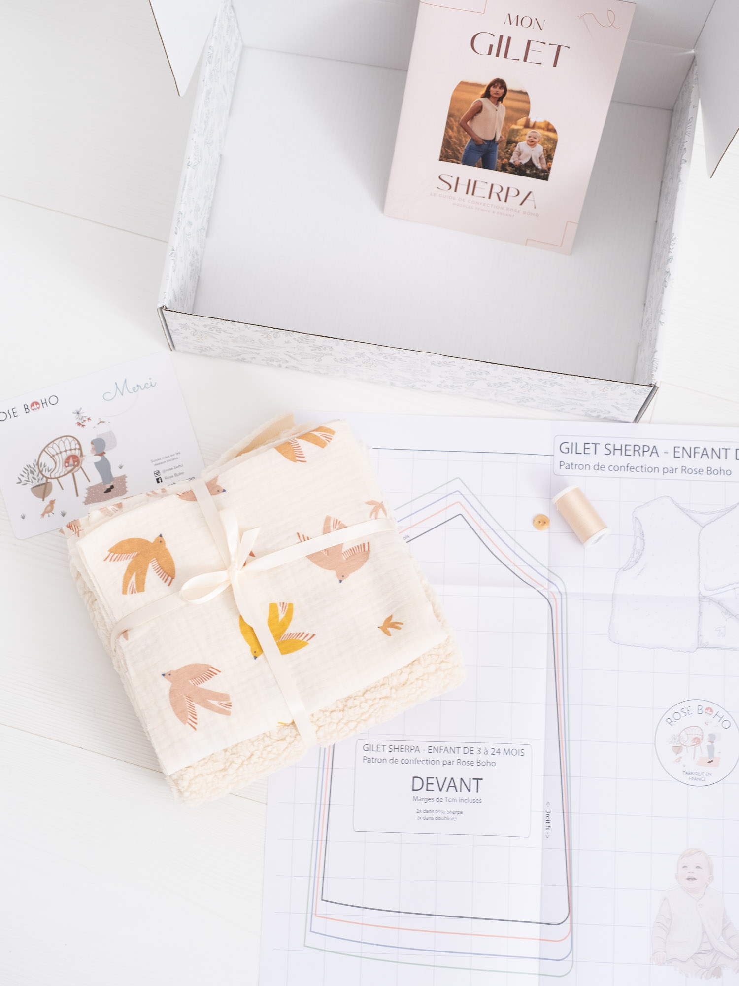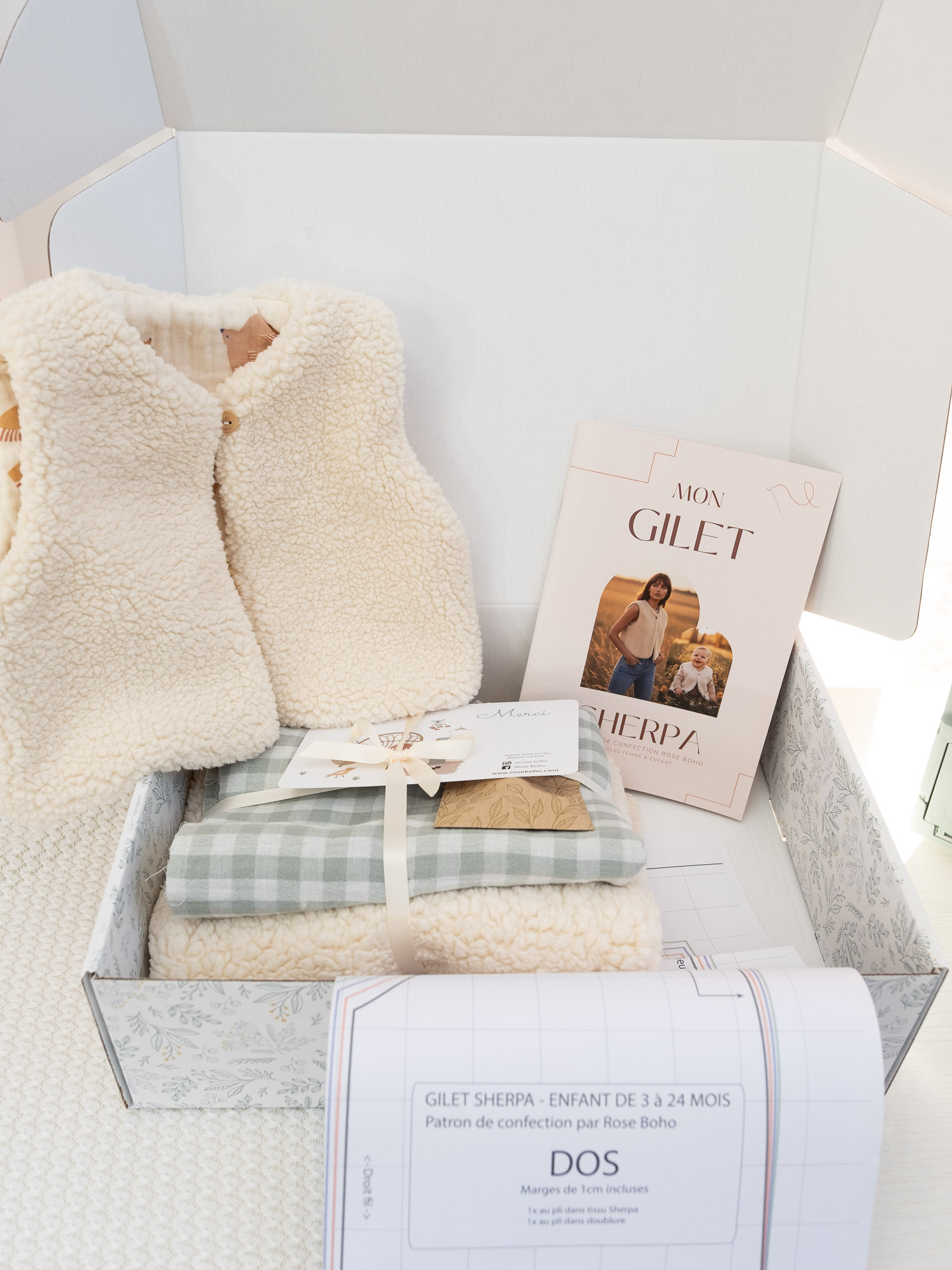 Créez un gilet sherpa tout doux pour bébé (3–24 mois) grâce à notre box DIY complète : patron, guide illustré, fil, bouton bois, élastique et tissus au choix. Un joli projet couture, accessible et guidé pas à pas, pour imaginer une pièce unique et moelleuse !