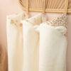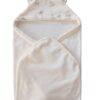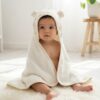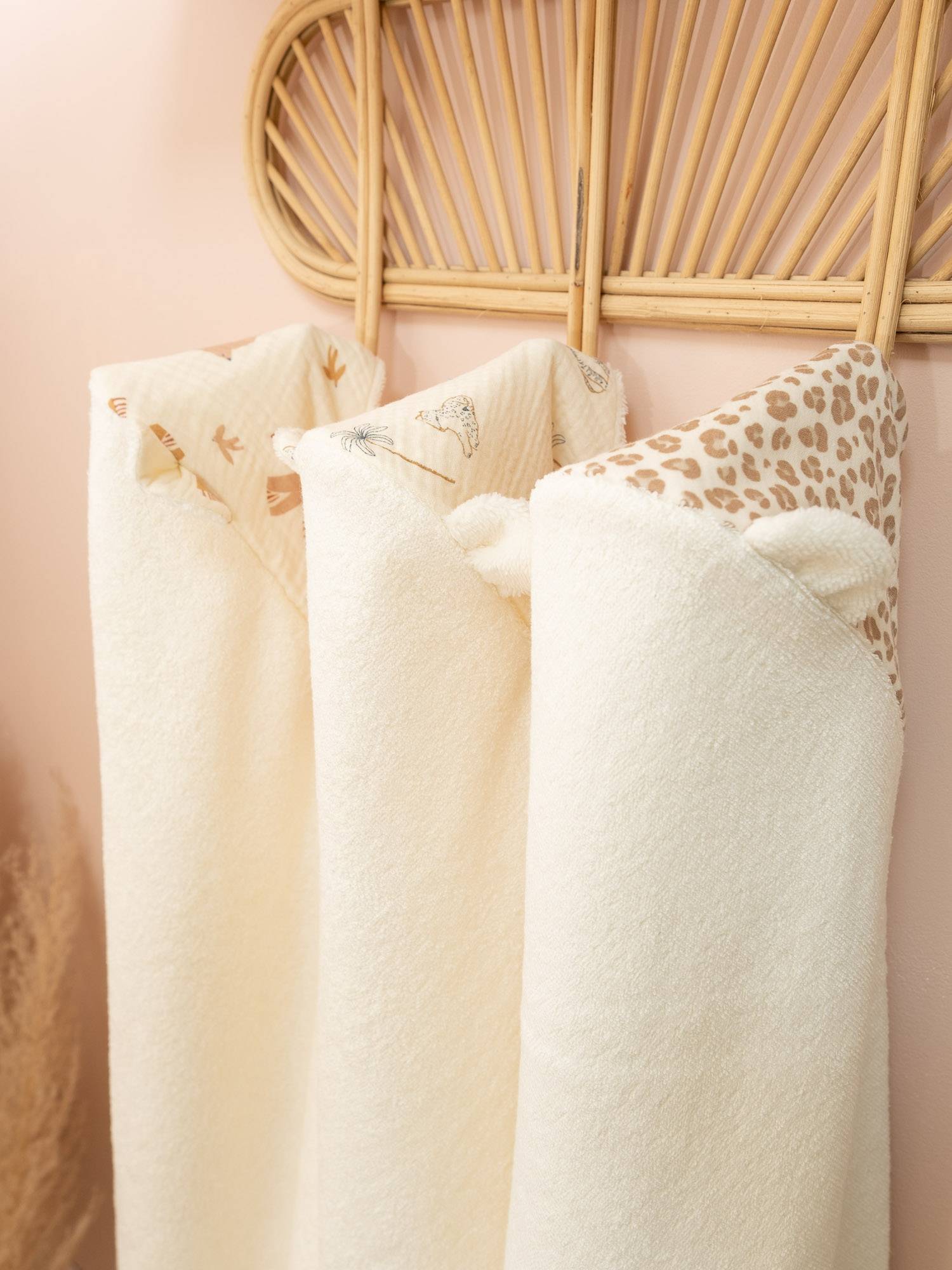 Tissu capuche et oreilles d’ourson,  100% coton. Éponge couleur crème en coton et viscose de bambou hydrophile et super absorbant. La cape est bordée d’un biais pour une belle finition.