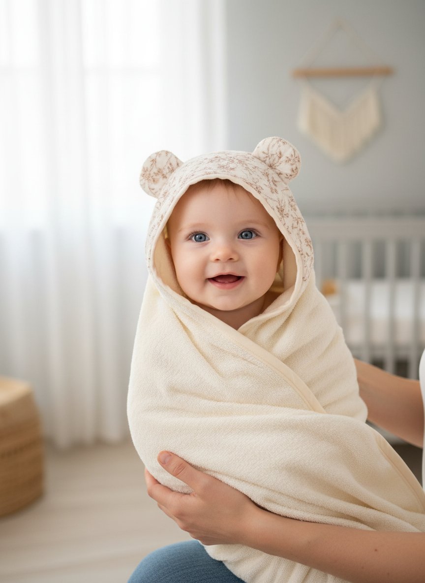 Enveloppant bébé de douceur après son bain, la cape ourson le réconforte dans une étreinte chaleureuse, transformant chaque instant en une tendre parenthèse de bonheur.