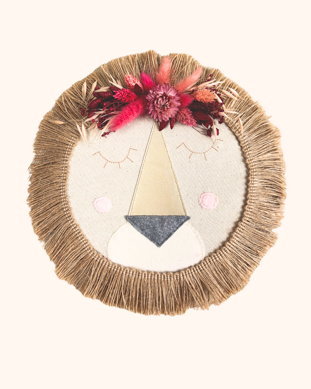 Un lion majestueux orné de fleurs éclot sur le mur, mêlant force et délicatesse.