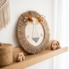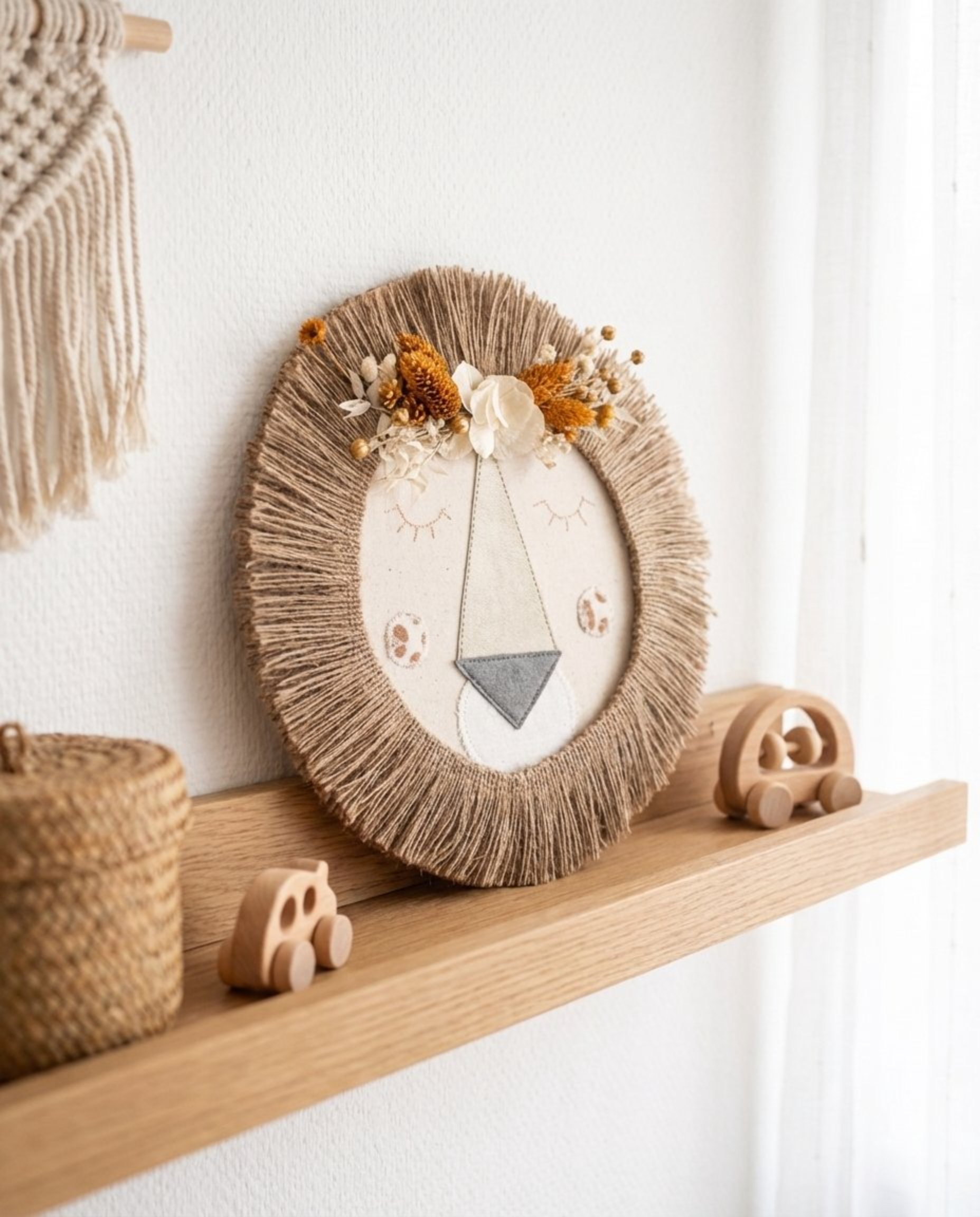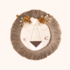 Dimensions tambourin : Petit 16 cm diamètre /Grand 18 cm Dimensions avec crinière : Petit 22 cm / Grand 25 cm Détails lion : Visage  : coton bachette beige Museau: simili cuir doré Nez : Feutrine grise Bouche : velours cotelé beige Joues : velours de la couleur que vous aurez choisi Crinière : jute Couronne de fleurs séchées créées par la créatrice Blømeko ( collaboration), chaque couronne est unique, se rapprochant des photos au plus proche, mais sans garantie d’avoir une création parfaitement identique.