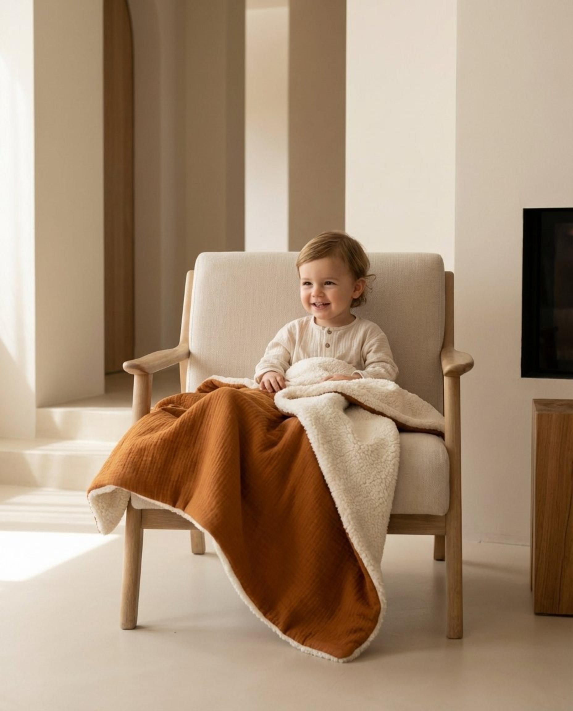 Tissu recto 100% Coton double gaze Bio (Selon choix). Tissu verso sherpa 100% polyester Oeko-Tex, très doux, effet mouton. Epaisseur :